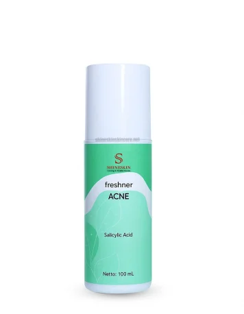 Freshner Acne shineskin / toner acne shineskin adalah penyegar untuk perawatan kulit berminyak dan berjerawat yang mengandung salicylic acid. Manfaat dari salicylic acid adalah membantu membuka pori-pori tertutup oleh kotoran dan minyak serta menetralisir bakteri yang ada. Bahan ini juga dapat ditemukan pada beberapa tumbuhan salah satunya adalah pohon willow, namun sangat jarang sekali. Selain dapat menyembuhkan dan mengeringkan jerawat, bahan ini juga dapat membantu menghilangkan komedo. Yuk cek paket perawatan wajah berjerawat shineskin.